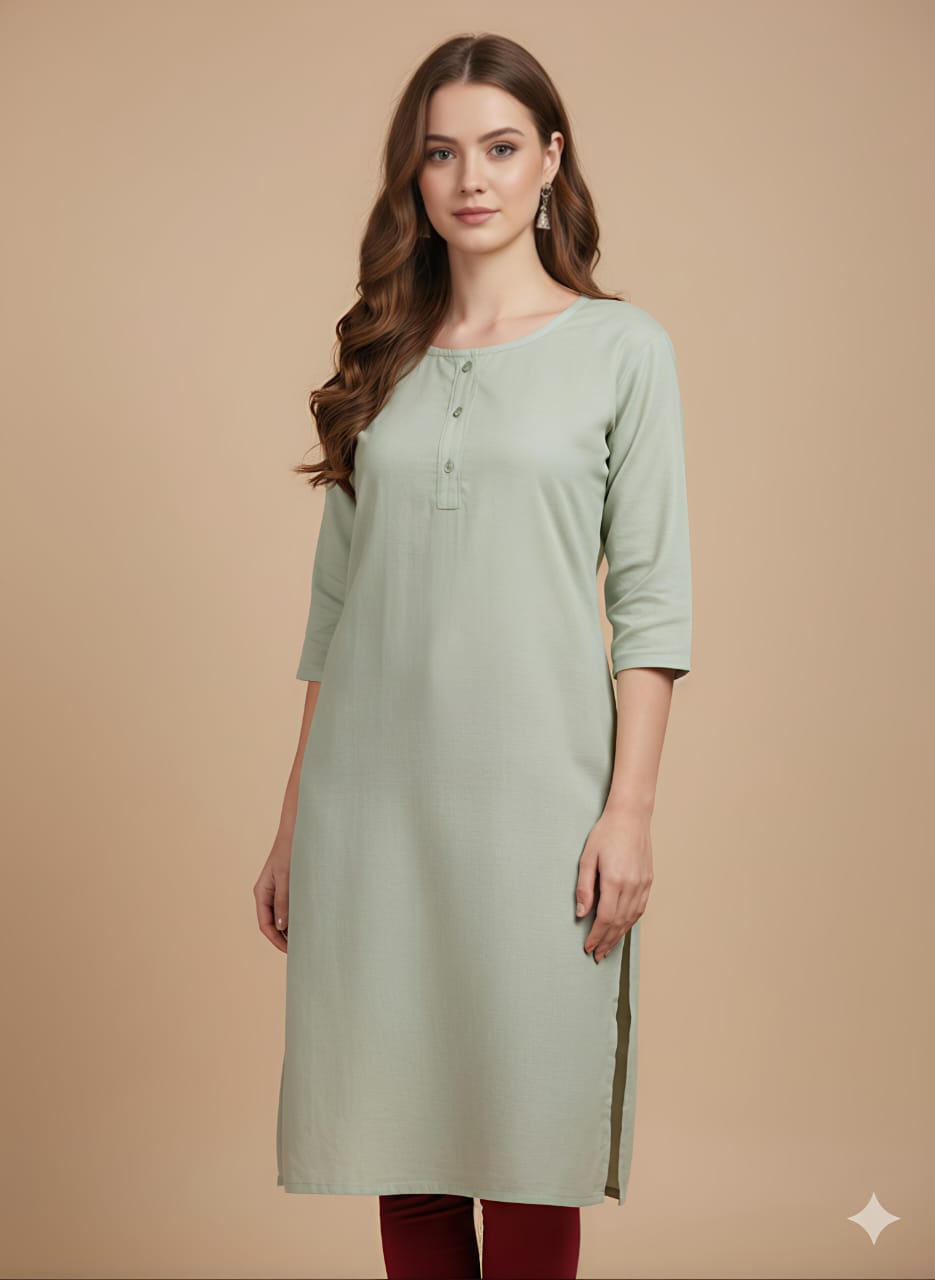 This top features a round neckline and three-quarter sleeves, with subtle detailing like pin-tucks on the yoke and small dots across the fabric. Available in sizes XXL