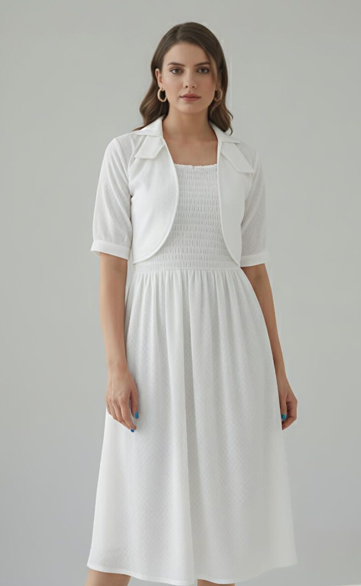 Elevate your wardrobe with this stunning white-colored dress and matching jacket set. The A-line midi dress features a smocked top and a square neckline, perfect for a chic and sophisticated look. Pair it with the matching bolero jacket for a polished finish.