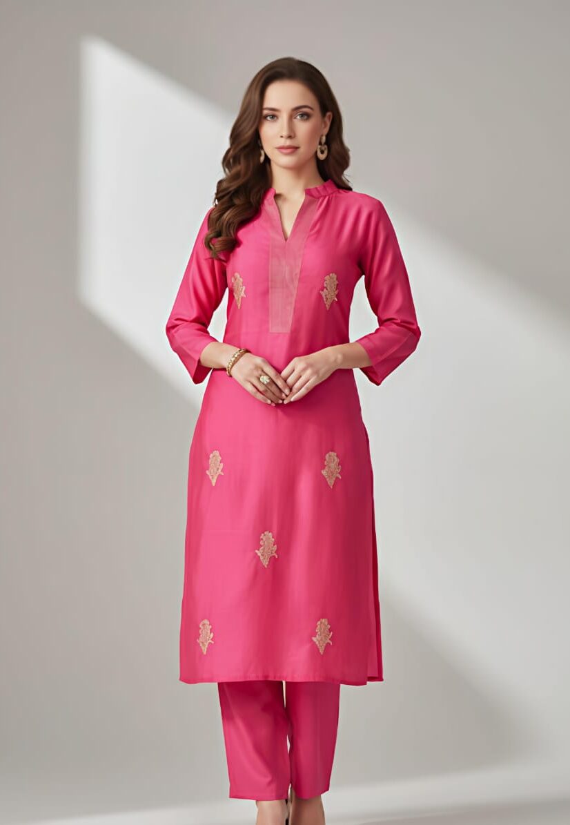 This outfit is a kurti with pants, featuring a top with pin-tuck detailing on the yoke and three-quarter sleeves. The kurti has a subtle dotted pattern and is paired with matching pants. The model is wearing silver sandals, adding a touch of elegance.