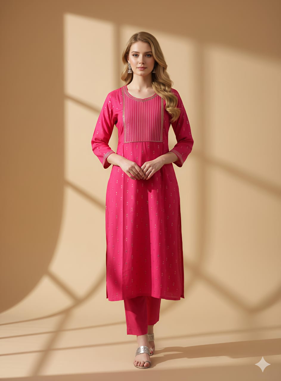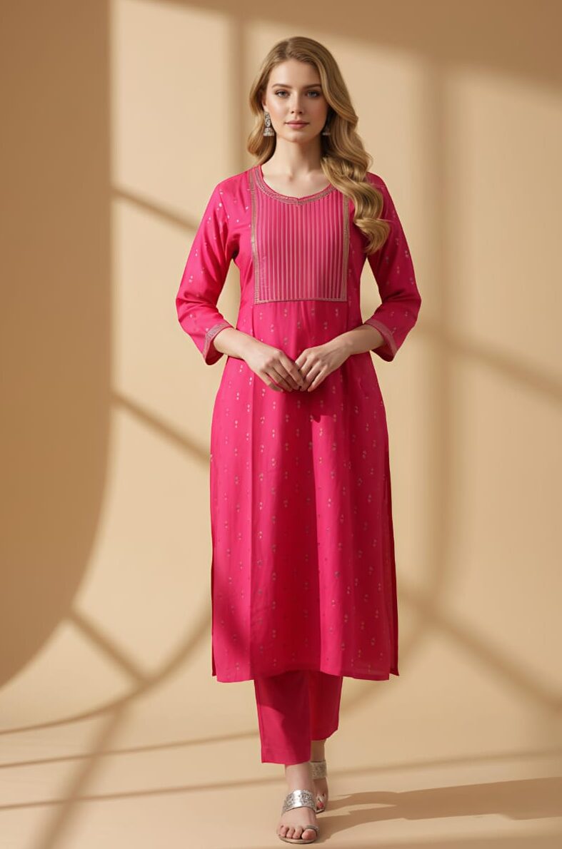 This top features a round neckline and three-quarter sleeves, with subtle detailing like pin-tucks on the yoke and small dots across the fabric. Available in sizes L and XL. Fabric cotton