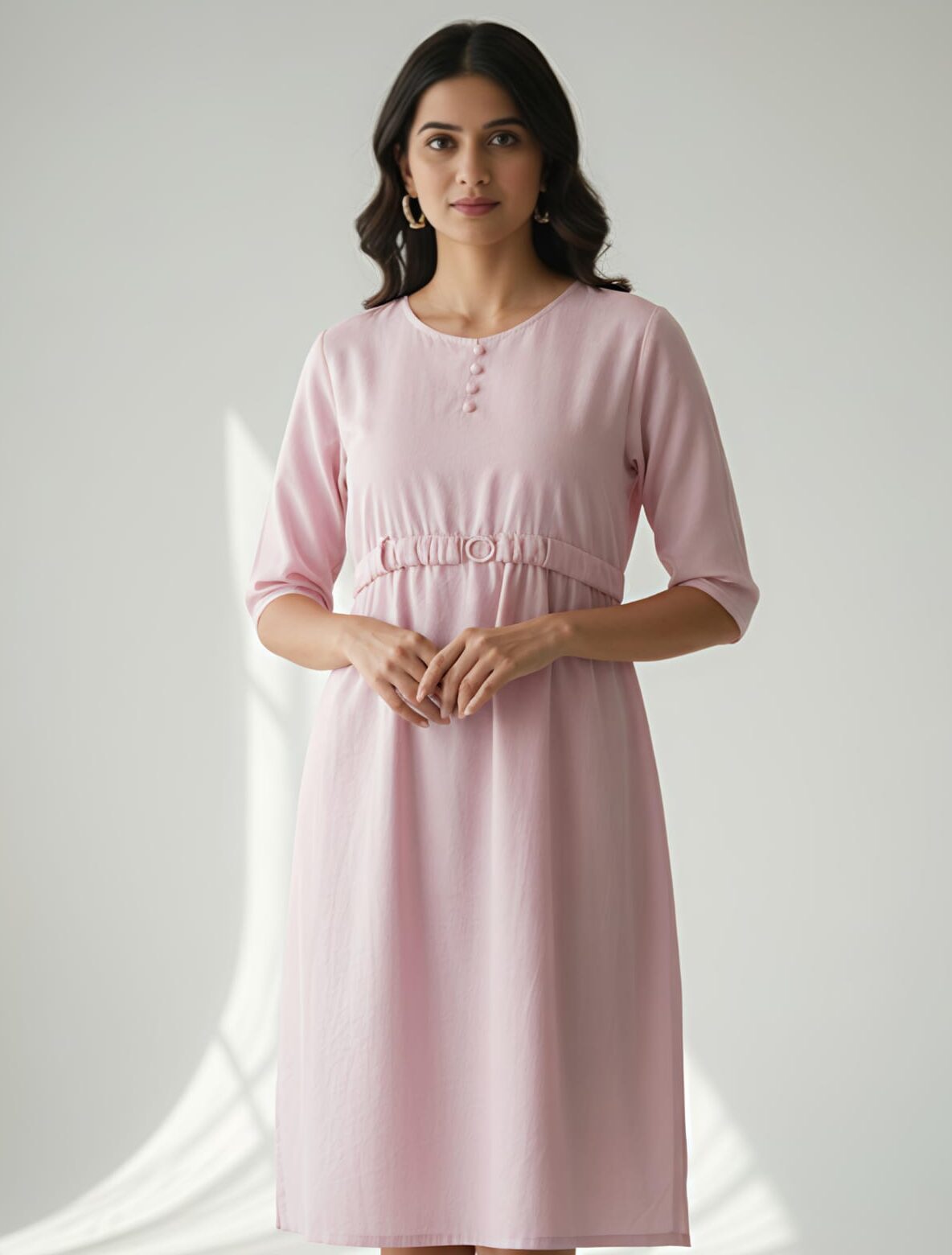 Stay stylish and comfortable in this beautiful pink frock. With its round neck, three-quarter sleeves, and belted waist, this dress is perfect for any occasion.