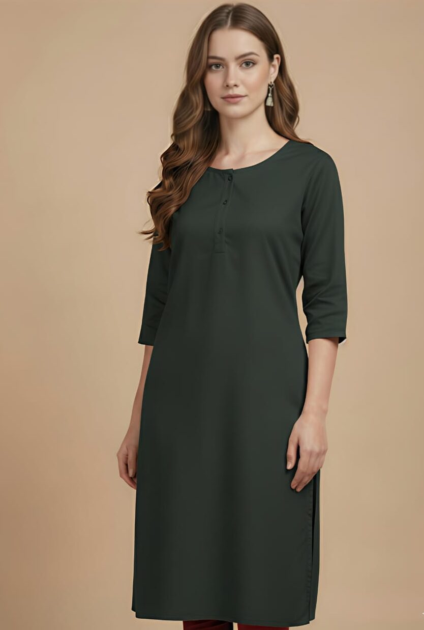 This top features a round neckline and three-quarter sleeves, with subtle detailing like pin-tucks on the yoke and small dots across the fabric. Available in sizes XL