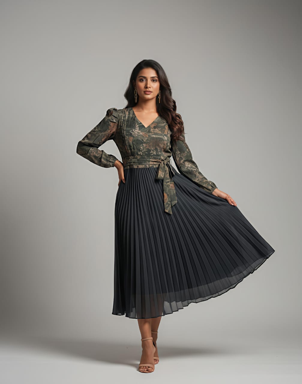 – Skirt Details: Pleated skirt flowing outwards