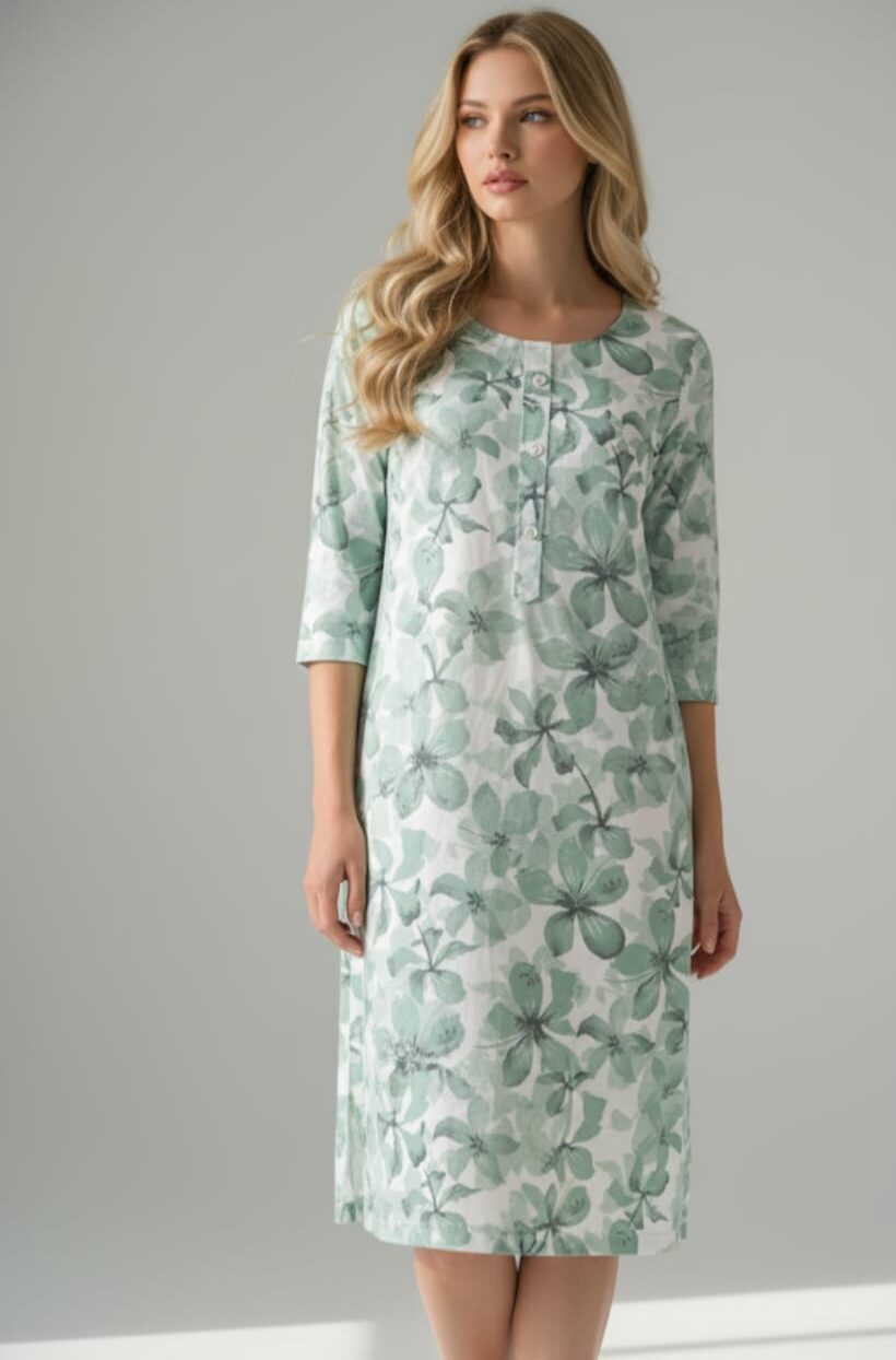 this top features a round neckline and three-quarter sleeves, with subtle detailing like pin-tucks on the yoke .