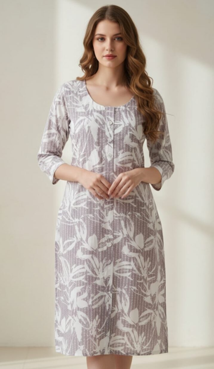 This top features a round neckline and three-quarter sleeves, with subtle detailing like pin-tucks on the yoke .