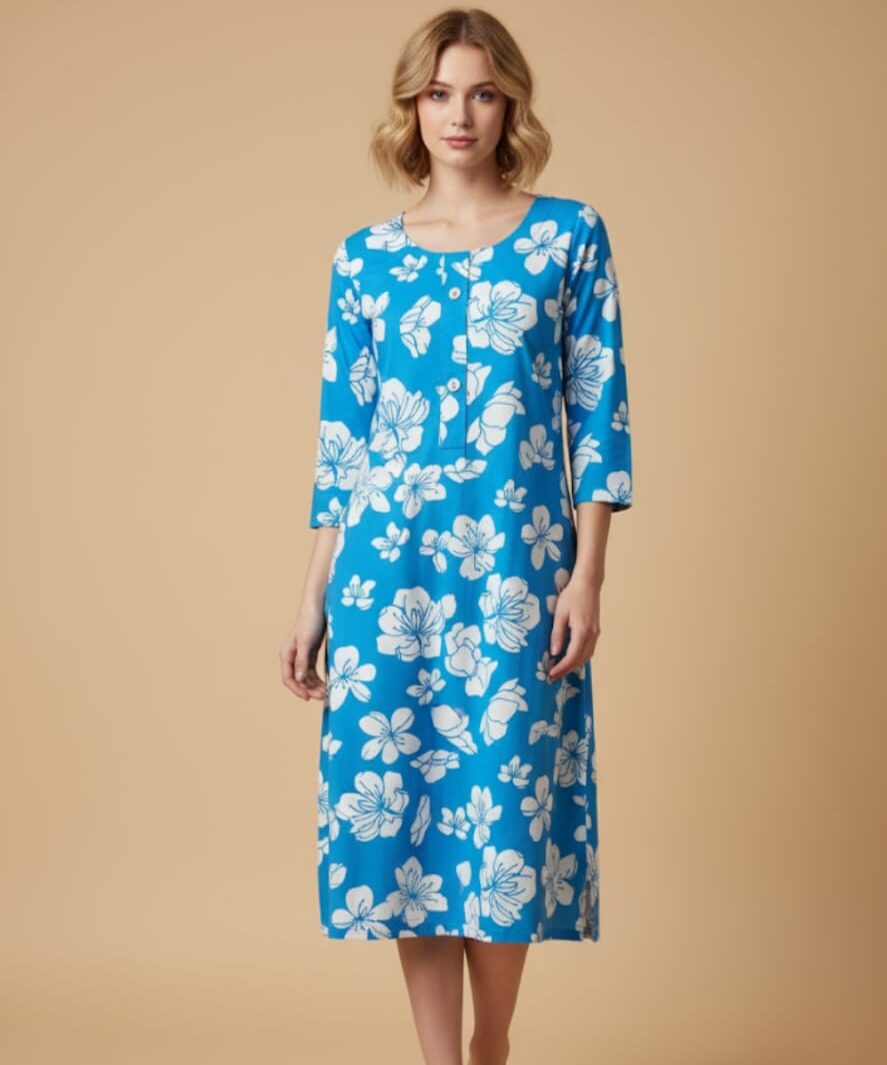 This top features a round neckline and three-quarter sleeves, with subtle detailing like pin-tucks on the yoke .