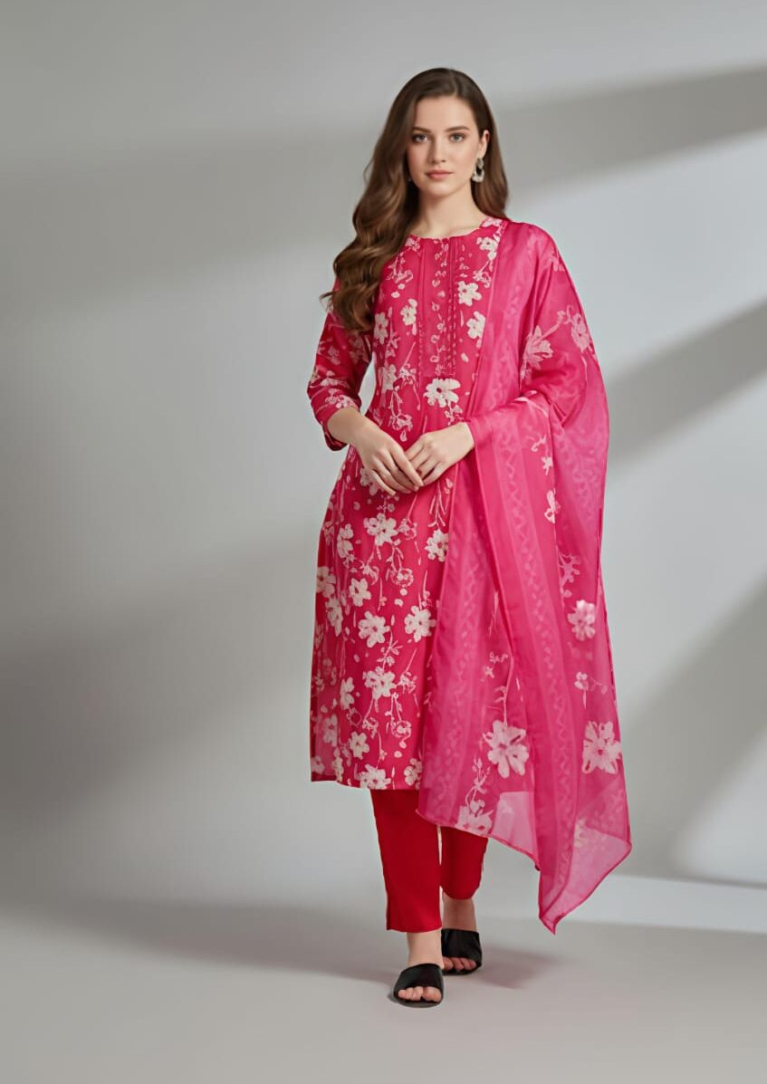 This outfit is a stunning ensemble consisting of a top, pants, and a shawl. The top has a beautiful floral pattern and features a button detail at the neckline. Paired with matching pants that have intricate detailing at the bottom, this outfit is completed with a shawl that complements the top and pants with its matching floral pattern.