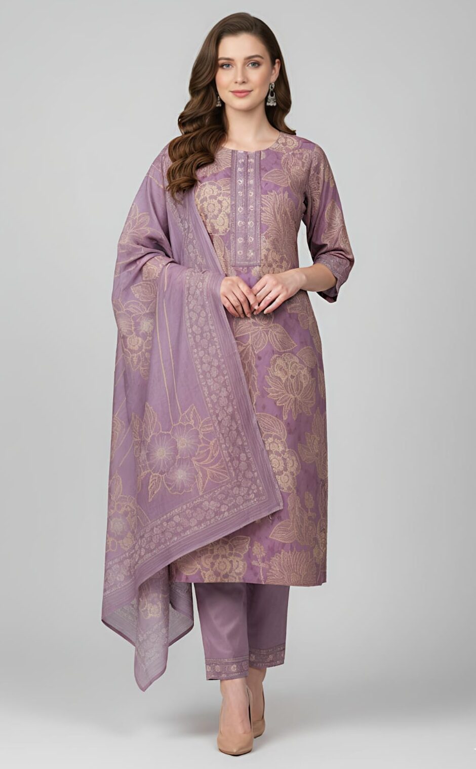 This outfit is a stunning ensemble consisting of a top, pants, and a shawl. The top has a beautiful floral pattern and features a button detail at the neckline. Paired with matching pants that have intricate detailing at the bottom, this outfit is completed with a shawl that complements the top and pants with its matching floral pattern.