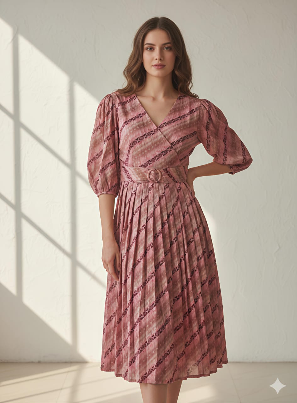 – Style: Midi dress with a V-neck, puffy sleeves, and pleated skirt
